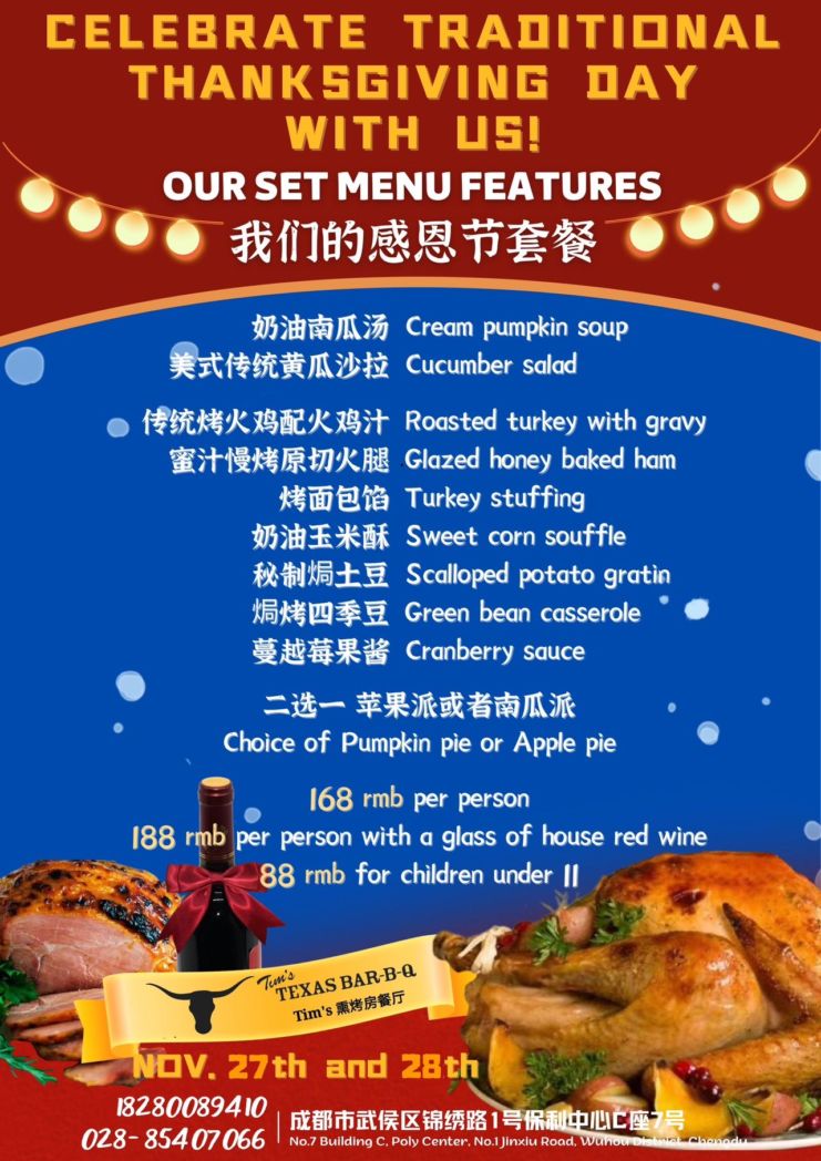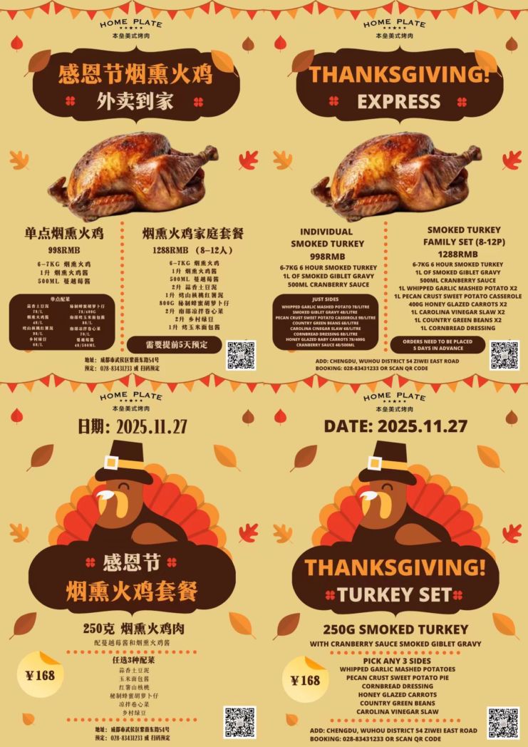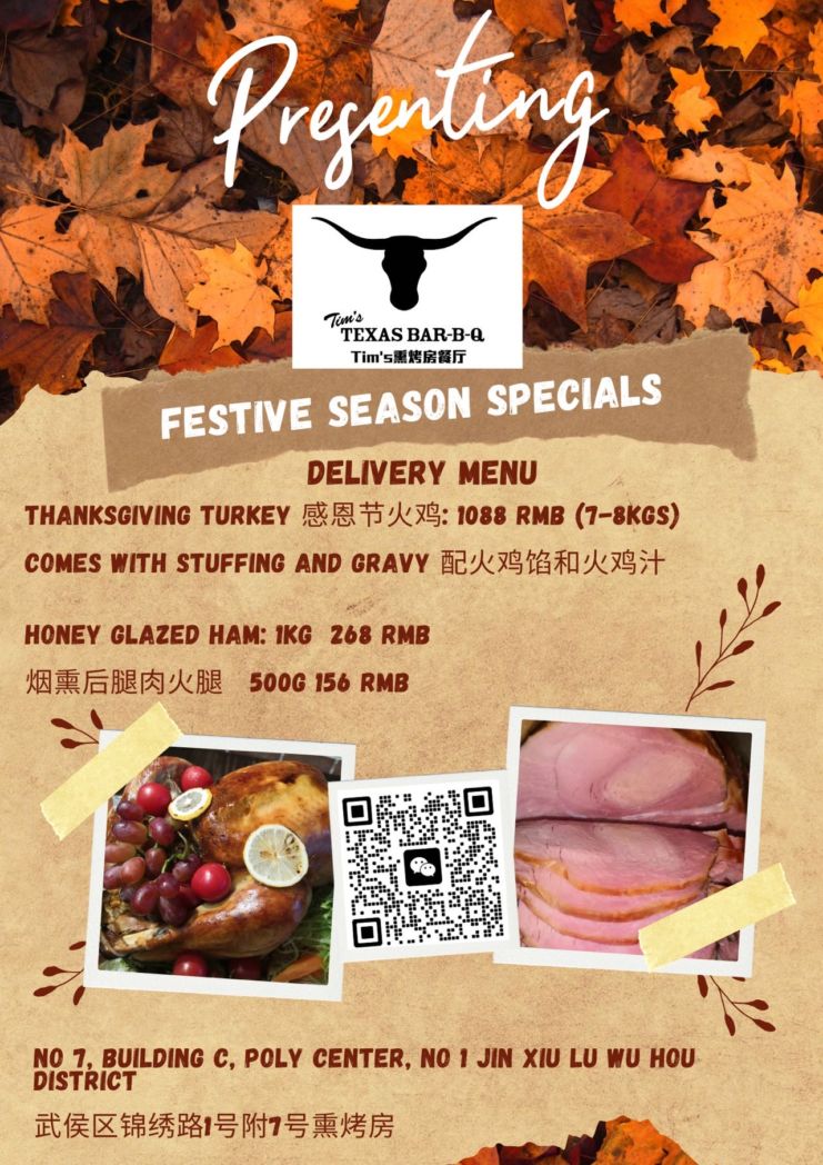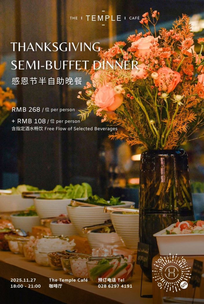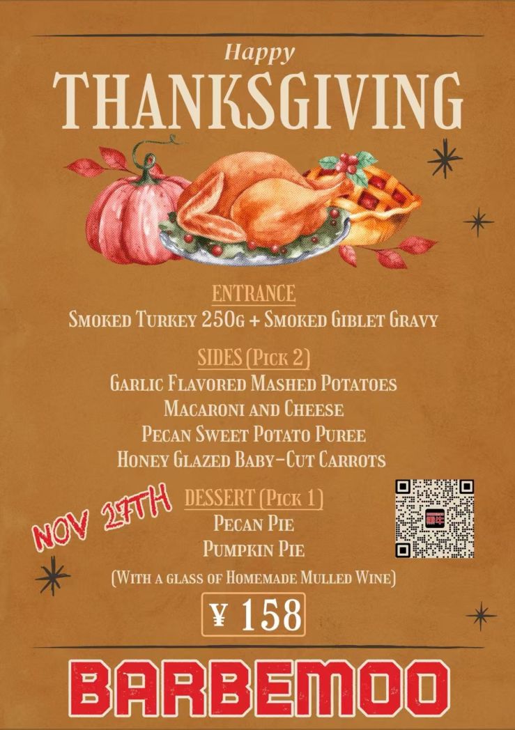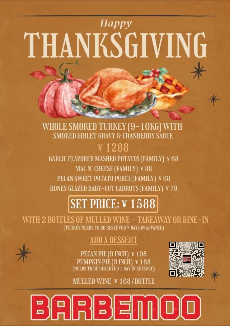 🦃 Indulge in a Delicious feast for just 188 RMB per person on Saturday, November 30th, from 11:30 AM to 3:00 PM.