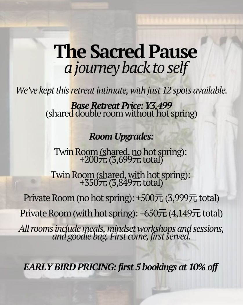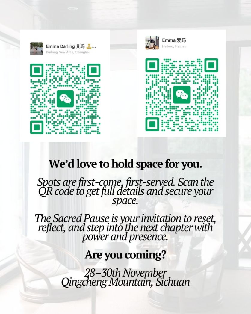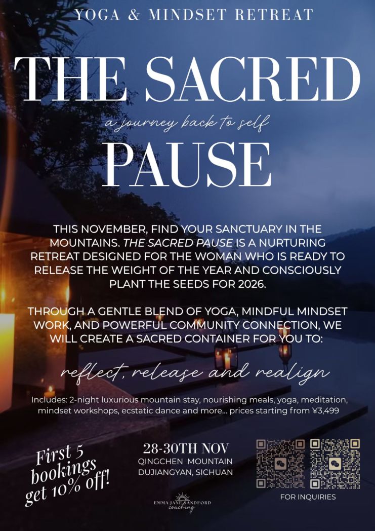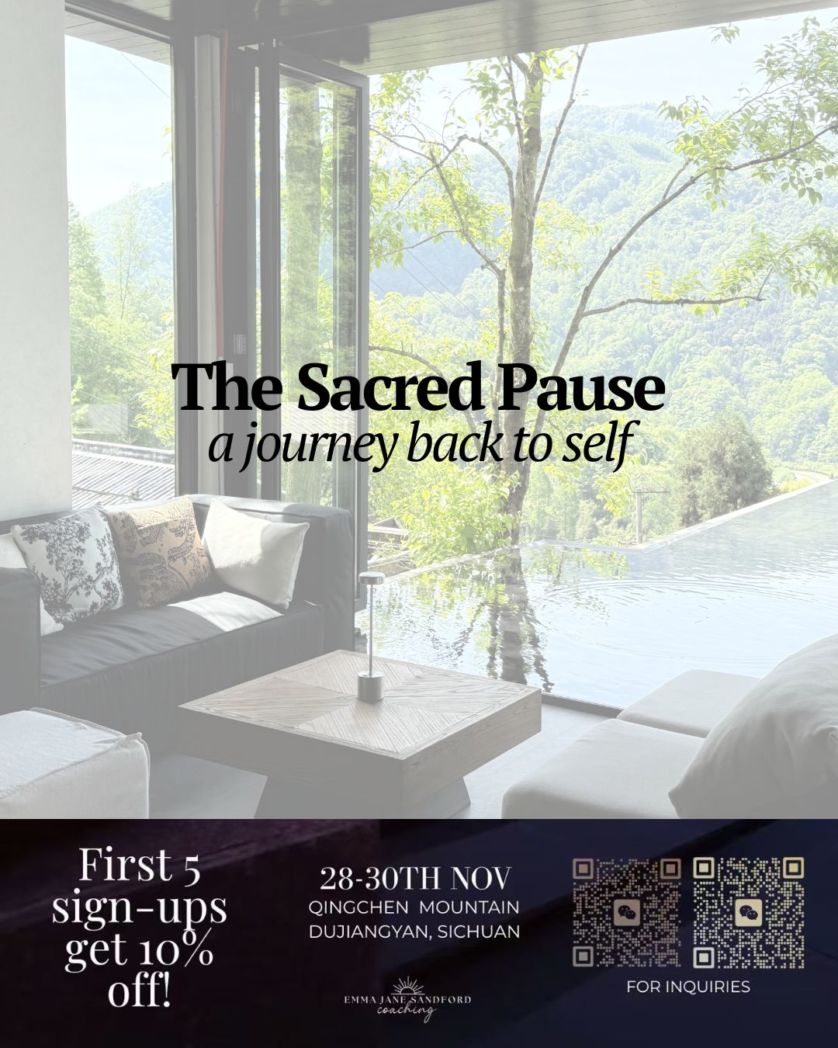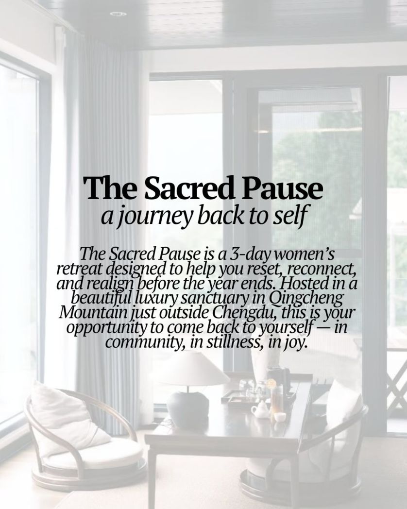 The Sacred Pause is a 3-day women’s retreat designed to help you reset, reconnect, and realign before the year ends. Hosted in a beautiful luxury sanctuary in Qingcheng Mountain just outside Chengdu, this is your opportunity to come back to yourself — in community, in stillness, in joy.