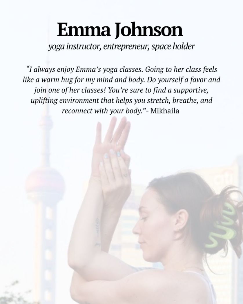 Emma Johnson is a yoga instructor based in the vibrant metropolis of Shanghai. Her journey began over eight years ago in Chengdu, where she first fell in love with yoga and the practice truly felt like a homecoming. Yoga became her sanctuary, a challenging yet deeply comforting constant during times of need. Believing wholeheartedly in its power, Emma became a qualified instructor to share this gift with others. Having discovered her own inner wisdom on the mat, she now guides others to find theirs. She specializes in Yin Yoga and curates gentle, loving flows that thoughtfully combine meditation, pranayama, and affirmation.