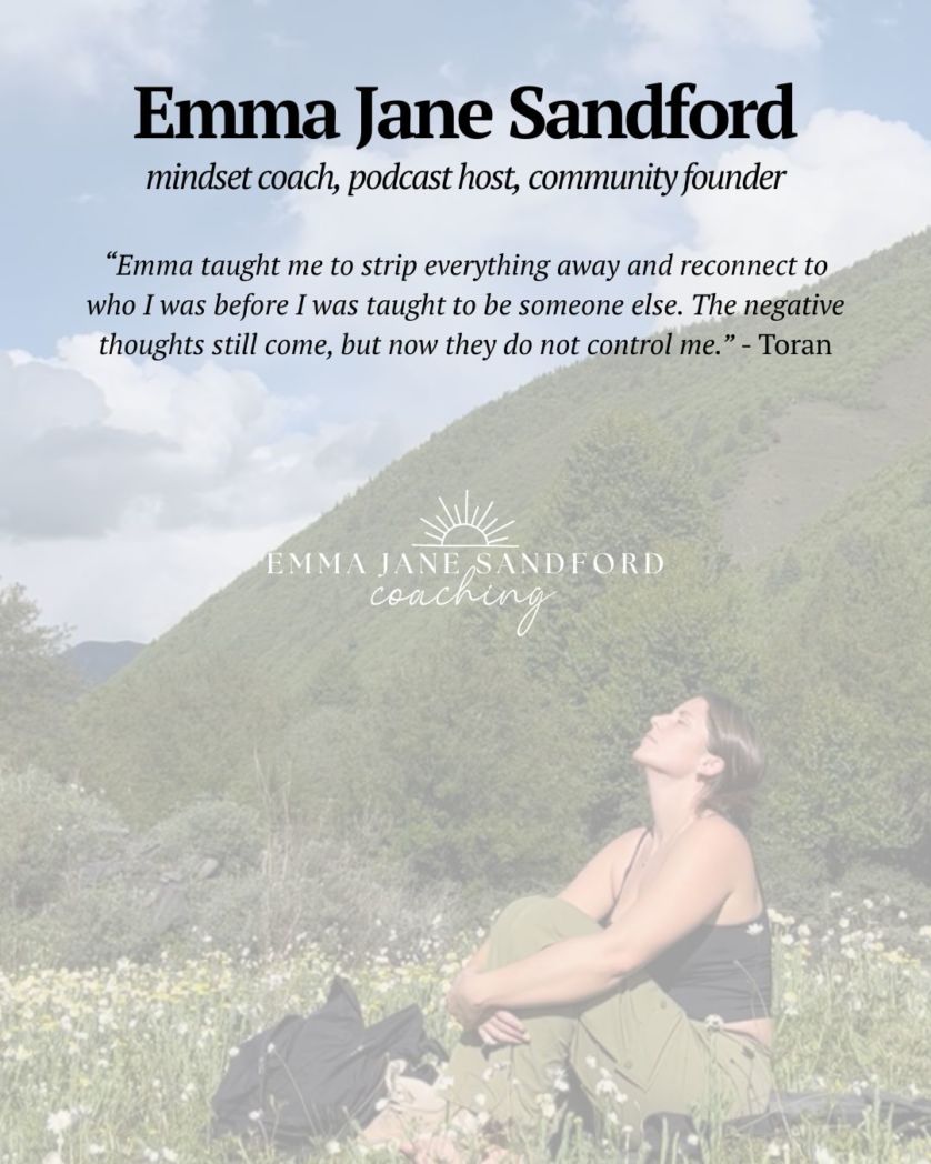 Emma Jane Sandford is a Mindset & Life Coach who has supported over 50 women over the past two years. She’s also a podcast host and founder of an online community that helps women reclaim their power and purpose. Her coaching blends powerful mindset tools, somatic practices, and tools like EFT tapping, breathwork, visualisation, and Human Design. Her mission is to remind you who you are beneath all the conditioning, the limiting beliefs, and the programming. She’s been where many of us have been: stuck in an endless loop of productivity and perfectionism, burnt out, disconnected from joy. Through her own healing from an eating disorder and people-pleasing, she’s now committed to making life an experiment in fun, softness and playful growth.