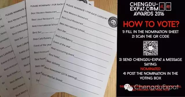 Come along to our stand and fill out your nomination forms. Once you’ve done this send a message to Chengdu-Expat WeChat to let us know you’ve nominated.