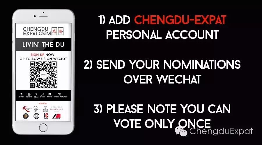 Come along to our stand and fill out your nomination forms. Once you’ve done this send a message to Chengdu-Expat WeChat to let us know you’ve nominated.