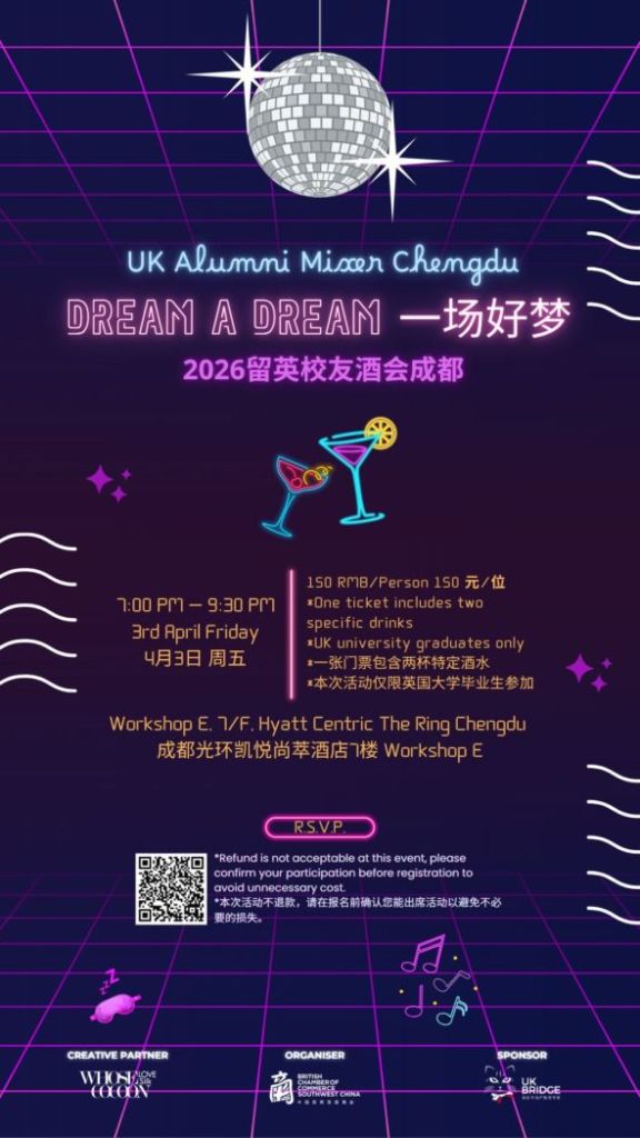 The 2026 UK Alumni Gathering is coming to Chengdu! Join us on Friday, 3rd April at Hyatt Centric The Ring Chengdu for an evening themed “Dream a Dream” — where comfort meets connection. Dress in your own style and come ready to unwind. Whether you graduated last year or decades ago, if you’ve ever studied in the UK, this night is for you. Expect familiar faces, great conversations, and a relaxed, welcoming atmosphere. We’ll have signature drinks, fun games, and plenty of stories to share — from all-night study sessions to late-night kitchen chats. This spring, come as you are, and reconnect with those who truly get it. See you in Chengdu for an unforgettable night!