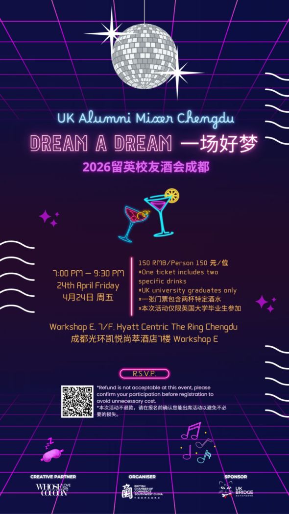 The 2026 UK Alumni Gathering is coming to Chengdu! Join us on Friday, 24th April at Hyatt Centric The Ring Chengdu for an evening themed “Dream a Dream” — where comfort meets connection. Dress in your own style and come ready to unwind. Whether you graduated last year or decades ago, if you’ve ever studied in the UK, this night is for you. Expect familiar faces, great conversations, and a relaxed, welcoming atmosphere. We’ll have signature drinks, fun games, and plenty of stories to share — from all-night study sessions to late-night kitchen chats. This spring, come as you are, and reconnect with those who truly get it. See you in Chengdu for an unforgettable night!
