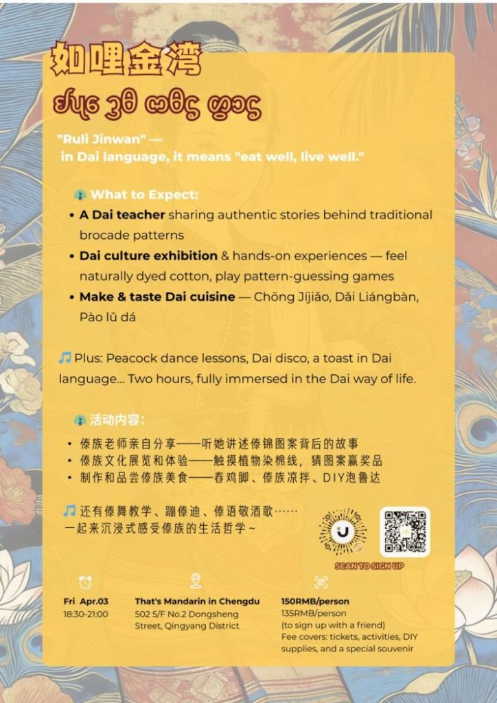 · Dai culture exhibition & hands-on experiences — feel naurally dyed cotton, play pattern-guessing games