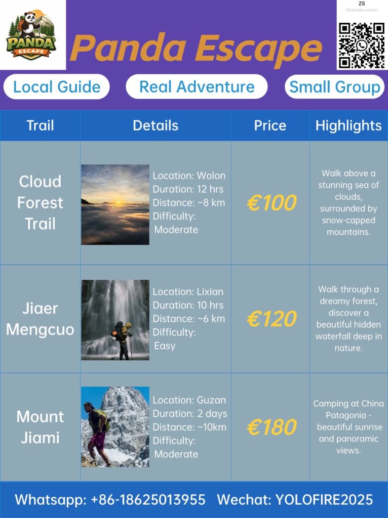 Panda Escape offers all-inclusive small-group hiking adventures for travelers who want to experience the wild side of Chengdu beyond the city. We take you to hidden trails, mountain viewpoints, waterfalls, and unforgettable landscapes that most tourists never see. We also offer kayak and camping tours.We’re a local, friendly, English-speaking outdoor community focused on fun, safety, and real experiences. Whether you’re traveling solo or with friends, this is a great way to explore nature, meet new people, and enjoy a stress-free day trip.