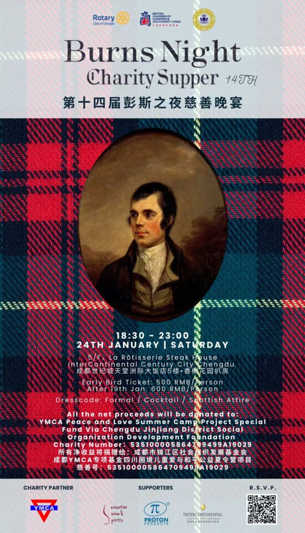 We are delighted to invite you to the 14th Annual Charity Burns Night Supper, jointly organised by the British Chamber of Commerce Southwest China, Rotary Club Chengdu and the Chengdu Malt Whisky Club to take place on 24th January, as we continue our shared mission of uniting culture, fellowship, and charitable giving.