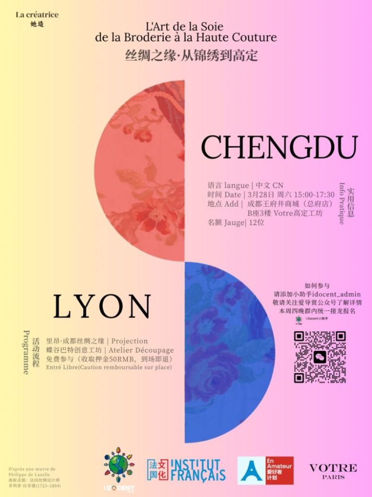 From the 1895-1897 records of Lyon’s Chamber of Commerce, Chengdu was hailed as the “Chinese Lyon” for its silk trade. This weekend, i Docent will share the silk bond between Chengdu and Lyon. You can also join a workshop merging French Découpage with Oriental brocade to create cross-time fashion.