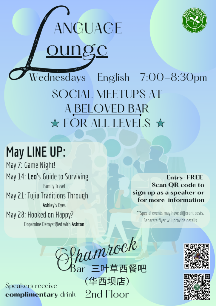 Get ready to immerse yourself in a world of English – language fun every Wednesday from 7:00 – 8:30 pm at the Language Lounge, located in the charming Shamrock Bar (Huaxi Ba branch, 2nd floor). This isn’t your ordinary language gathering. It’s a free, inclusive social event where everyone, from English novices to seasoned speakers, can come together, chat, and learn. In May, we’ve curated an exciting lineup of events. On May 14, Leo will be your guide, revealing the secrets to surviving family travel without a hitch. Then, on May 21, Ashley will take you on a cultural journey, sharing the rich Tujia traditions through her unique perspective. And on May 28, Ashton is going to demystify dopamine and show you how to embrace happiness. Here’s a sweet bonus: speakers get a complimentary drink! 🍹