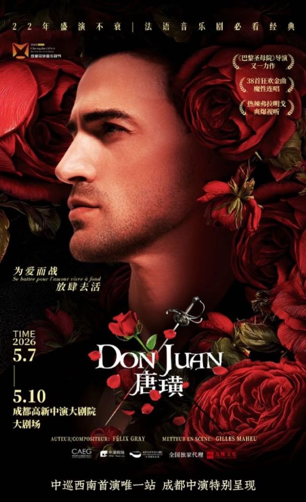 Catch the exclusive Southwest China debut of the iconic French musical Don Juan at Chengdu High-tech CPAA Grand Theatre, part of the 3rd Chengdu CPAA Musical Festival (May 7-10, 2026). Directed by Gilles Maheu (of Notre-Dame de Paris fame), this 22-year hit features 38 infectious cross-genre songs, passionate flamenco dances, and a gripping plot of desire vs. true love.