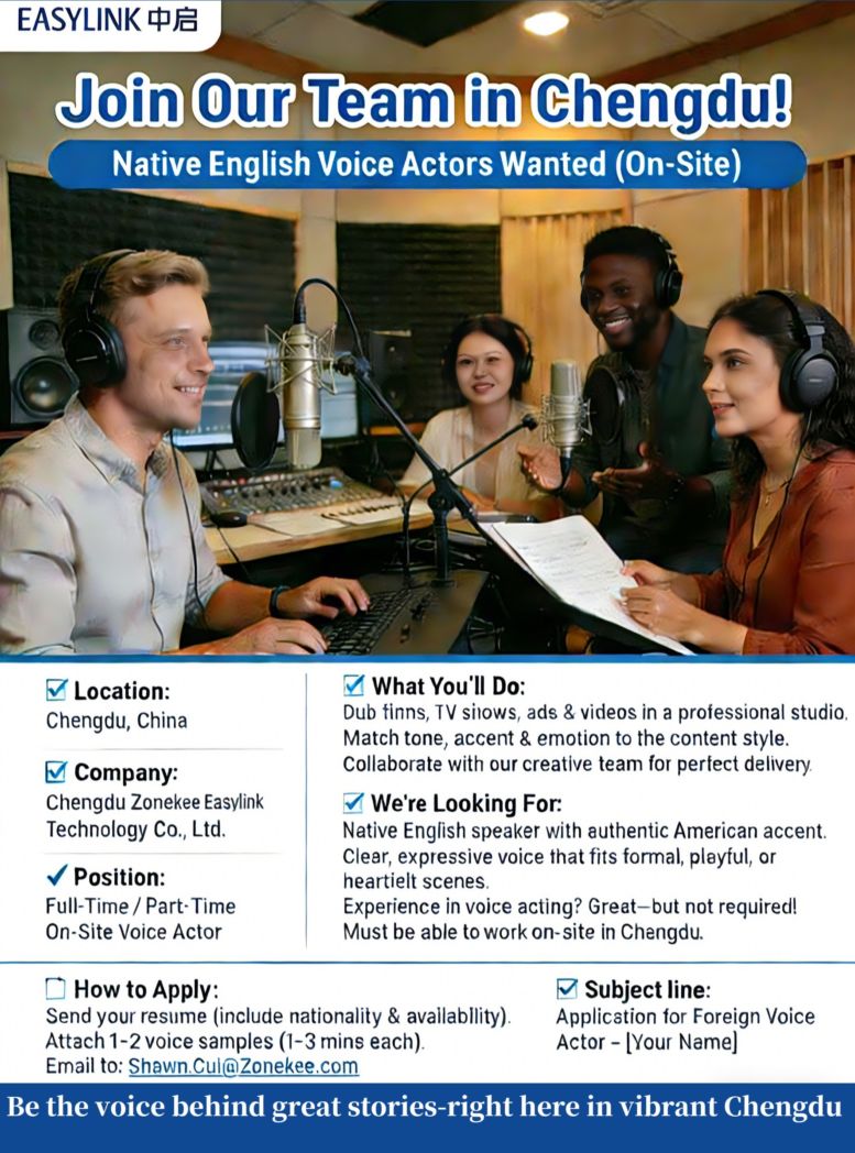 • Easylink Chengdu is recruiting full-time and part-time on-site voice actors – join our team!